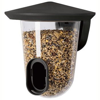 "Feedr Fuglefoderautomat i klar plast - Hyggelig fodring af vildtfugle i haven. Nem at hænge op eller montere. Ideel til fuglefrø. Velkommen fuglene med stil!"